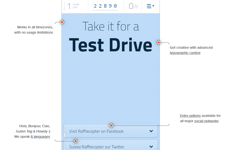 Rafflecopter est l’un des moyens les plus directs de lancer votre compétition. Les grandes marques l’utilisent pour leurs concours en ligne, tandis que les entrepreneurs preneurs l’utilisent pour la commodité et l’efficacité du plugin. Il faut moins de trois minutes pour configurer un concours cadeau et il est simple à intégrer à votre site Web. Copiez/collez simplement le code, puis déterminez où vous voulez que le widget apparaisse.