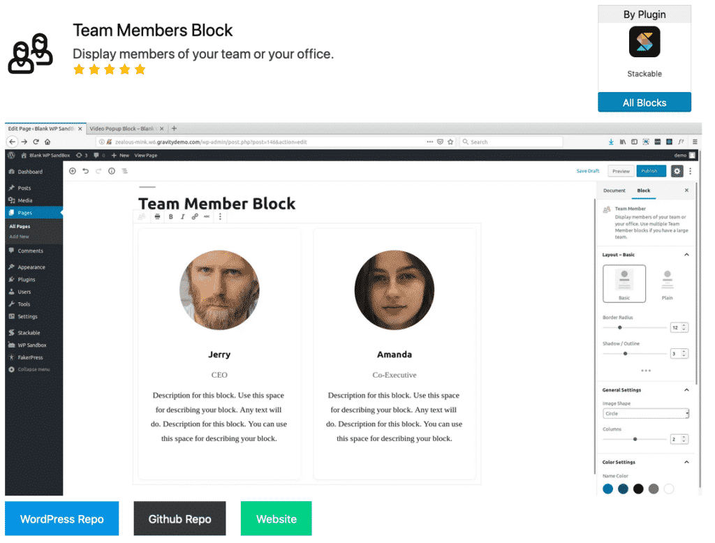 Pour la prochaine zone de notre page d’accueil, on aimerait afficher les formateurs-trice-s. On retourne sur ‘Gutenberg Block Library’, on tape ‘team’ dans le moteur de recherche et on tombe notamment là-dessus: (libre à vous de prendre un autre bloc. Ce sont des exemples).