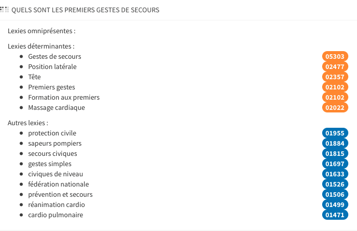 a) La formulation de votre sujet avant de rédiger le titre d’un article : Dès lors qu’un sujet est bien formulé, vous avez une chance supplémentaire de voir Google vous positionner quand il a identifié les internautes qu’il pense être intéressés. En avant-goût de l'article dédié : Essayez de trouver 2 ou 3 formulations, avec un verbe, qui décrivent au mieux selon vous le sujet de l’article. Vous allez calculer les metamots des différents sujets. Vous allez comparer ensuite les metamots et choisir celui qui vous semble le plus précis. Exemple : Vous voulez rédiger un article sur les premiers secours. Si Google comprend l'essence de votre article, il ne va pas se gêner pour reformuler une requête telle que "que faire en urgence" par le titre de votre article afin que vous ressortiez devant tout le monde. Auparavant, il aura "compris" ce que l'internaute voulait en réalité. L'internaute ne se rendra pas compte que sa requête a été modifiée. L'enjeu est donc de taille et c'est entre vos mains. Oui, mais comment s'assurer que Google va vous "comprendre" ? Ici, les metamots de "Quels sont les premiers gestes de secours" (utilisation de secours) et "comment pratiquer les premiers soins" (utilisation de soins). Je pourrais en avoir d'autres.