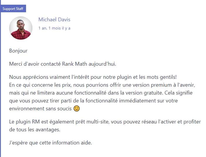 quand j’ai créé un compte chez Rank math, j’ai reçu un mail du CEO (automatique, marketing), j’ai répondu et il a répondu (ou un membre de son staff) mais ma question était: vous allez faire passer des fonctionnalités free en premium. Même réponse que pour vous: non, on travaille sur une version premium mais ce seront d’autres fonctionnalités. Je dois encore l’utiliser pour remplacer Yoast sur un site mais je le sens bien