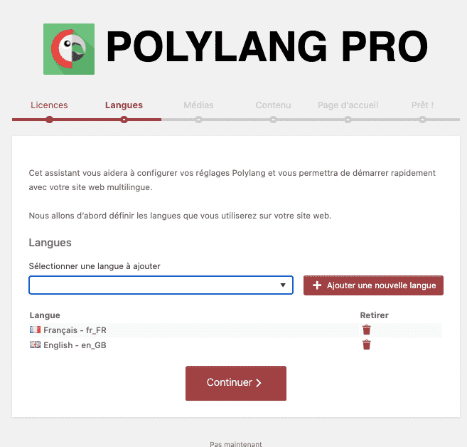 - Finalement, la dernière section "Configurer" devrait en fait être la première car il s'agit d'un wizard pour vous aider à configurer Polylang! En fait, cette section regroupe les 2 étapes précédentes, j'aurais aimé l'avoir en premier dans les sous-catégories pour commencer avec ce wizard directement: