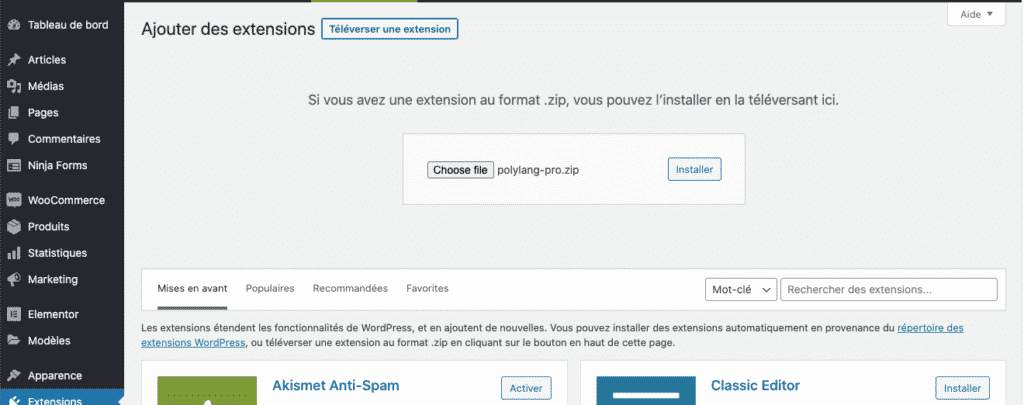 Avant de commencer, petit rappel: si vous avez installé et activé la version gratuite de Polylang, vous devez la désactiver avant d'installer Polylang Pro.