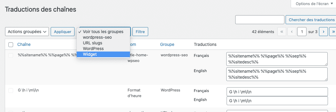 Suivre le même process pour le titre et les autres contenus SEO puis allez dans Langues > Traduction des chaînes, filtrez par "WordPress SEO" puis traduisez vos éléments SEO.