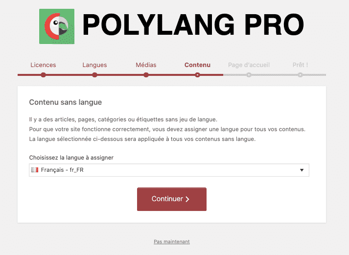 Etape 4 – Contenu. Cette étape permet de "dire" à Polylang quelle est la langue actuelle de votre site. Mes pages sont en Français donc je vais assigner "Français" par défaut à mes contenus. Notons, qu'une langue peut être ajouter plus tard, vous vous souvenez de notre sous- menu Langues?