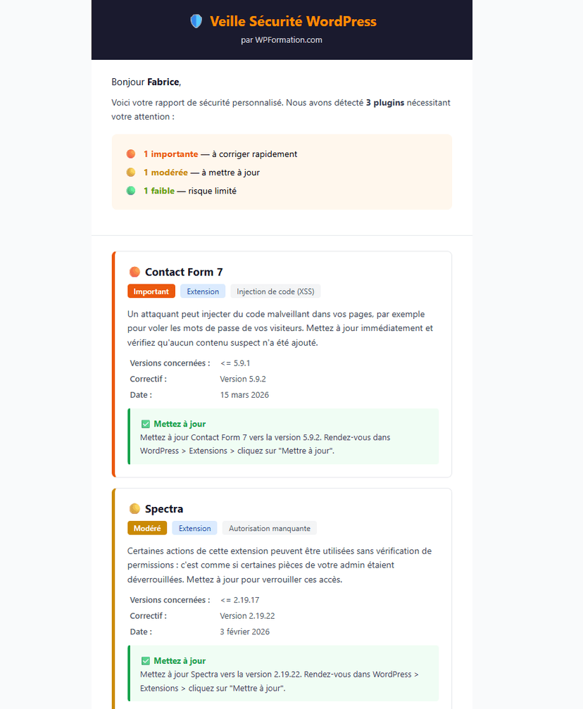 La vérification est quotidienne. Vous ne recevez un email que si une nouvelle faille est détectée sur un de vos plugins. Pas de récap hebdomadaire, pas de newsletter supplémentaire : uniquement les alertes pertinentes.